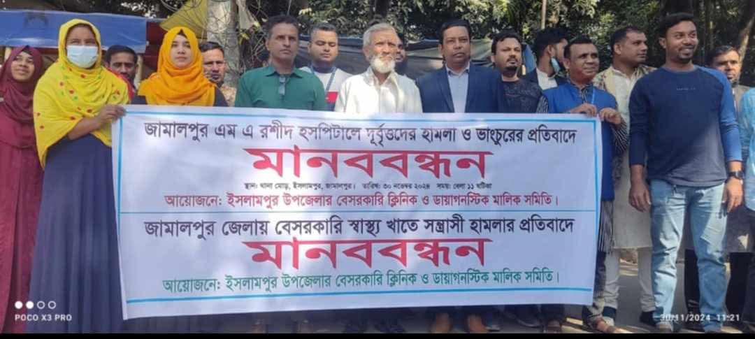 শনিবার(৩০নভেম্বর)সকালে পৌরশহরের থানা মোড় বটতলা চত্বরে উপজেলা বেসরকারি ক্লিনিক ও ডায়াগনস্টিক মালিক সমিতি আয়োজনে বক্তব্য রাখেন, হযরত শাহ কামাল হাসপাতাল পরিচালক এডভোকেট আনছার আলী,তুষার ডায়াগনস্টিক সেন্টারে পরিচালক আব্দুল লতিফ, জামালপুরে এপোলো বেসরকারি হাসপাতালে পরিচালক মোরাদুজ্জামান মোরাদ,ল্যাব কেয়ার ডায়াগনস্টিক পরিচালক আলম খান,যমুনা বেসরকারি হাসপাতাল পরিচালক রফিকুল ইসলাম, প্রাইম ডায়াগনস্টিক সেন্টারে পরিচালক আব্দুল হাকিম প্রমুখ।