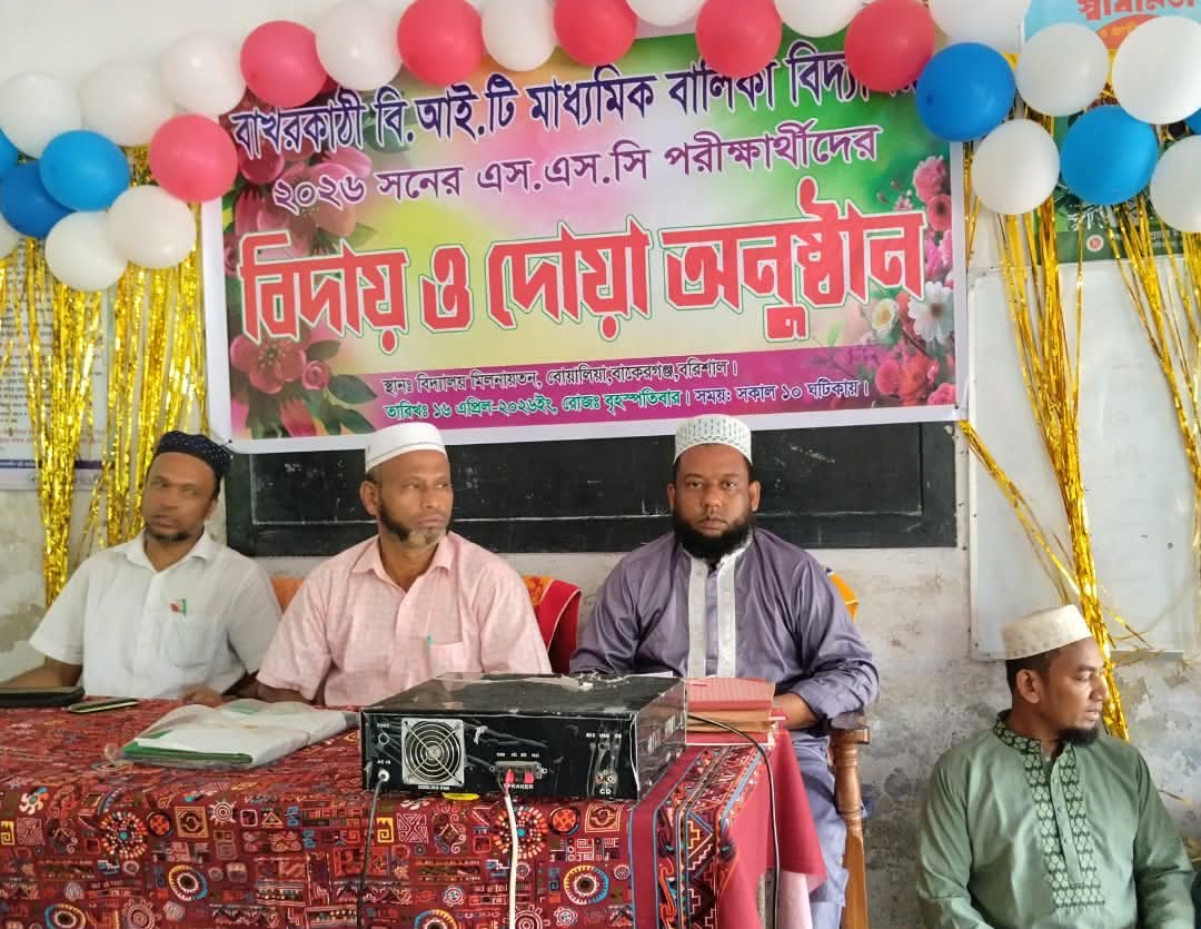 জাহিদুল ইসলাম :- বাকেরগঞ্জ ১২ নং রঙ্গশ্রী ইউনিয়নের ঐতিহ্যবাহী বাখেরকাঠি বি আই টি মাধ্যমিক বালিকা বিদ্যালয়ের ২০২৬ সালের এস এস সি পরীক্ষার্থীদের বিদায় ও ৬ষ্ঠ শ্রেনীর শিক্ষার্থীদের বরণ উপলক্ষ্যে " বিদায় অশ্রুঞ্জলী ও সাদর সম্ভাষণ অনুষ্ঠান উপলক্ষে ১৬ই এপ্রিল বৃহস্পতিবার সকাল ১১ টায় বিদ্যালয়ের হল রুমে দোয়া অনুষ্ঠানের আয়োজন করা হয়। বিদ্যালয়ের প্রধান শিক্ষক মোঃ ফজলুর রহমান খানের সভাপতিত্বে আয়োজিত অনুষ্ঠানে উপস্থিত ছিলেন বিদ্যালয়ের সকল শিক্ষক- শিক্ষিকা ও অধ্যায়নরত শিক্ষার্থীরা।