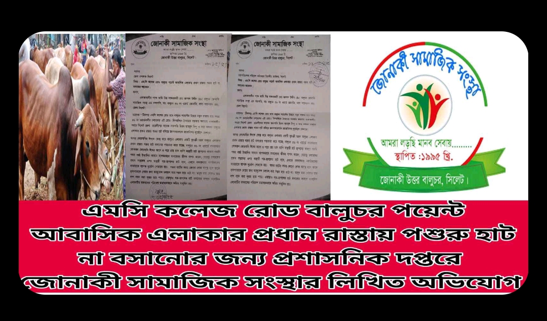 সিলেট নগরীর শাহপরান রহঃ থানাধীন ৩৬ নং ওয়ার্ড টিলাগড় এমসি কলেজ রোড হতে বালুচর পয়েন্ট থেকে এলাকায় প্রবেশ রাস্তার দুই পাশে গরুর হাট না বসানোর দাবিতে জোনাকী সামাজিক সংস্থা ও এলাকার গন্যমান্য ব্যক্তিবর্গের গনসাক্ষরে লিখিত অভিযোগ জানানো হয় সিলেট জেলা প্রশাসক বরাবর ও সিলেট সিটি করপোরেশন এবং পরিবেশ অধিদপ্তর সিলেট বিভাগীয় কার্যালয়ে।